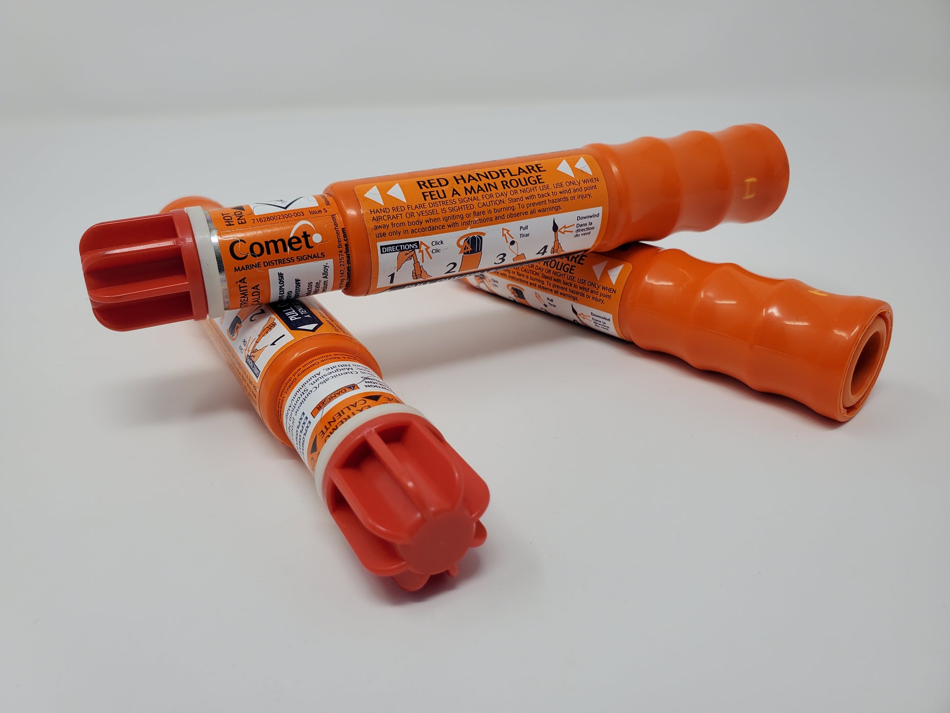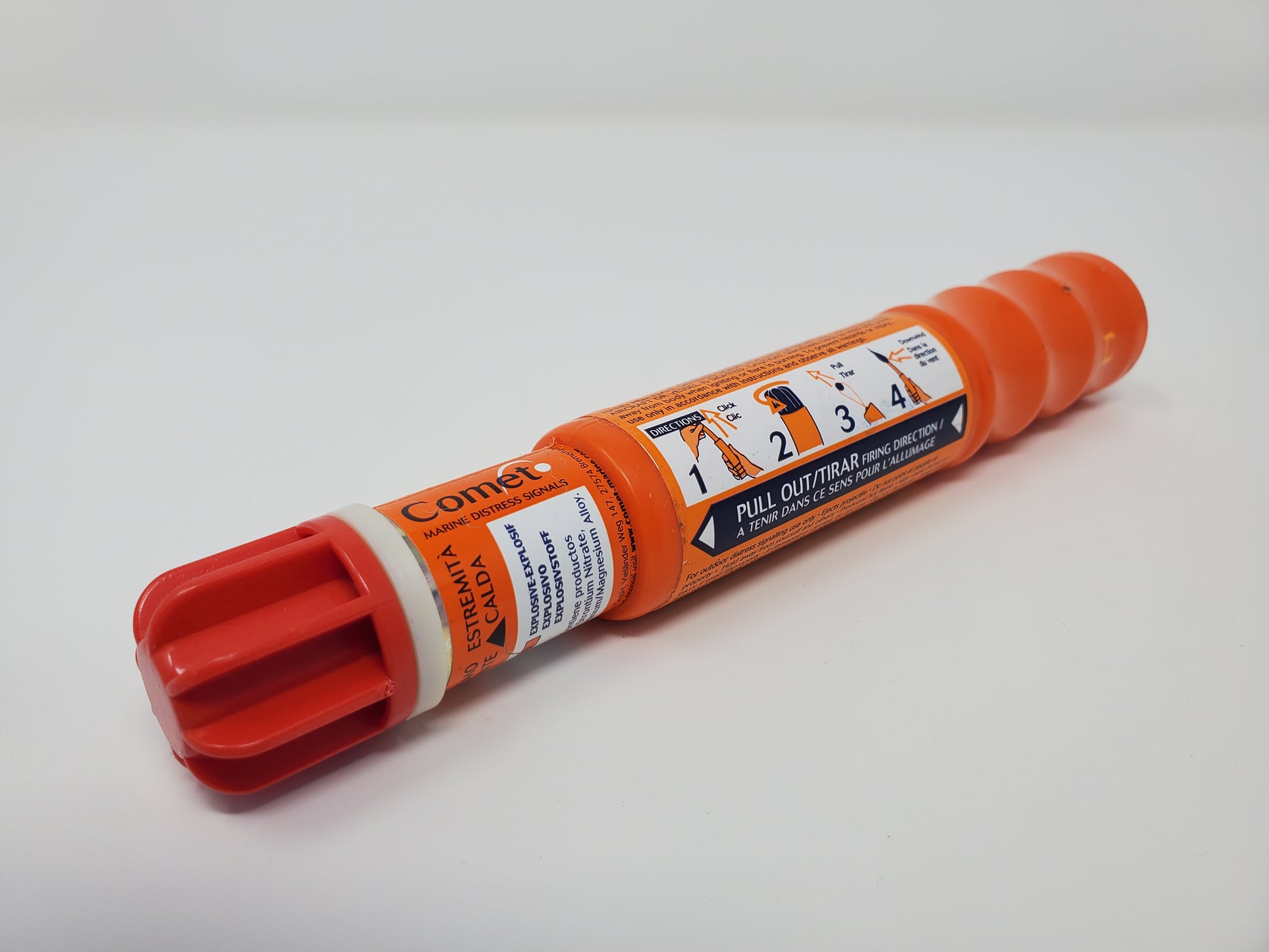The SOLAS flare is designed to show location and allow homing, with one-minute burn and 15,000 candela. The white flare for distress is designed to avoid collision in poor visibility with burn time of 40 seconds and 10,000 candela. Each weighs 10 ounces, measures, 5/8", 1 3/8" and will not drip molten slag down your arm. Red hand-held, short range distress signal. Used to pinpoint location by day or night. Burns for 60 seconds at 15,000 candela. Features a unique telescopic handle making it very compact and space saving when stowed in a liferaft. Easily extended and pull wire operated.